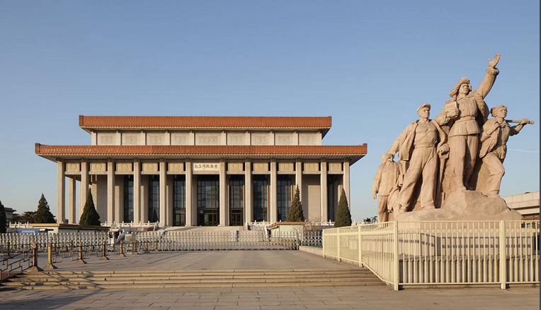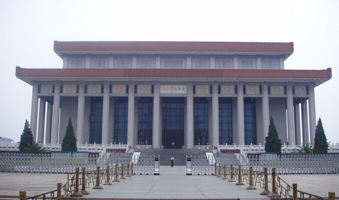 1976年11月24日按照中國共產黨中央委員會的決議,毛主席紀念堂在天安門廣場舉行奠基儀式,于1977年5月24日落成,占地57000多平方米,總建筑面積為28000平方米。主體呈正方形,外有44根福建黃色花崗石建筑的明柱,柱間裝有廣州石灣花飾陶板,通體青島花崗石貼面。屋頂有兩層玻璃飛檐,檐間鑲葵花浮雕。基座有兩層平臺,臺幫全部用四川大渡河旁的棗紅色花崗石砌成,四周環以房山漢白玉萬年青花飾欄桿。