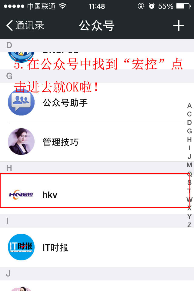 第四步:想找到關注的“宏控微信公眾號”在哪,進入到微信通訊錄,選擇公眾號,找到宏控HKV的公眾號即可