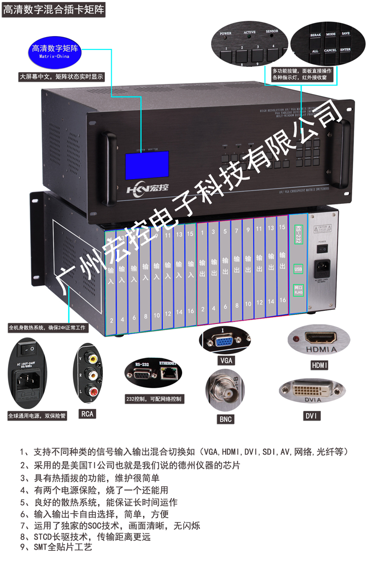 1、熱插拔結構:輸入信號支持AV,VGA帶音頻,色差(YPbPr),DVI,HDMI,3G/HD-SDI,RJ45,光纖,輸出支持HDMI,VGA帶音頻,DVI,RJ45,光纖。可任意擴展或更換輸入和輸出板。